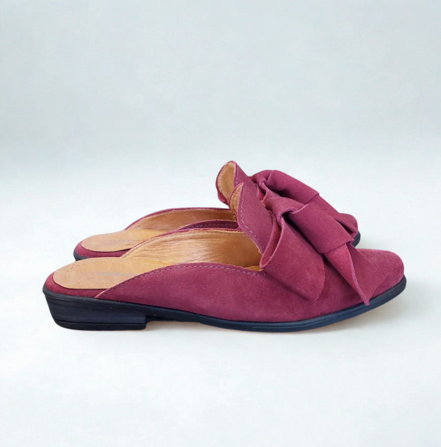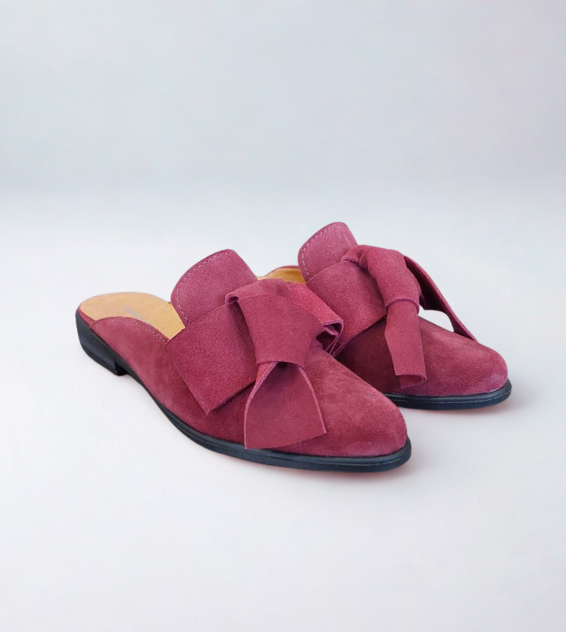 Babucha color burdeo en material tipo gamuza, con planta de goma flexible y cómoda. Su moño frontal aporta un toque delicado, y su altura de 2,5 cm la hace perfecta para el uso diario.
