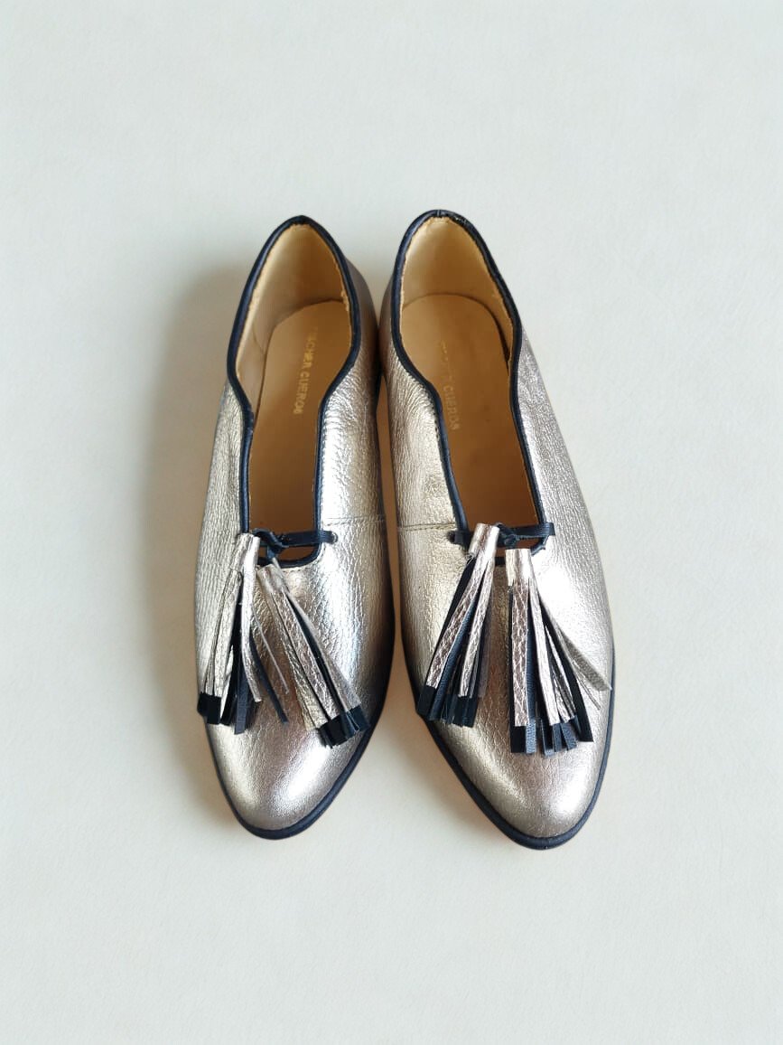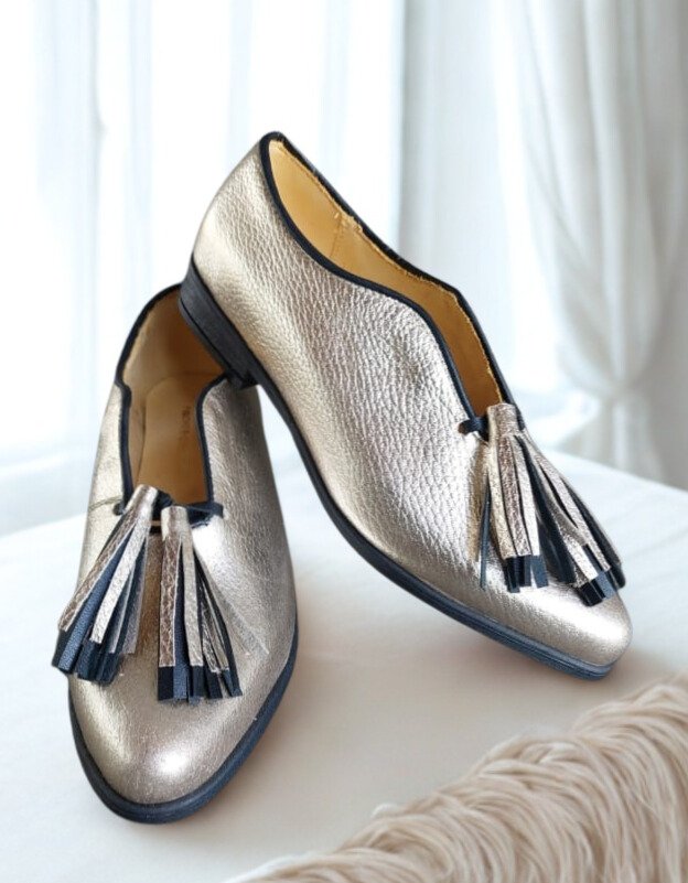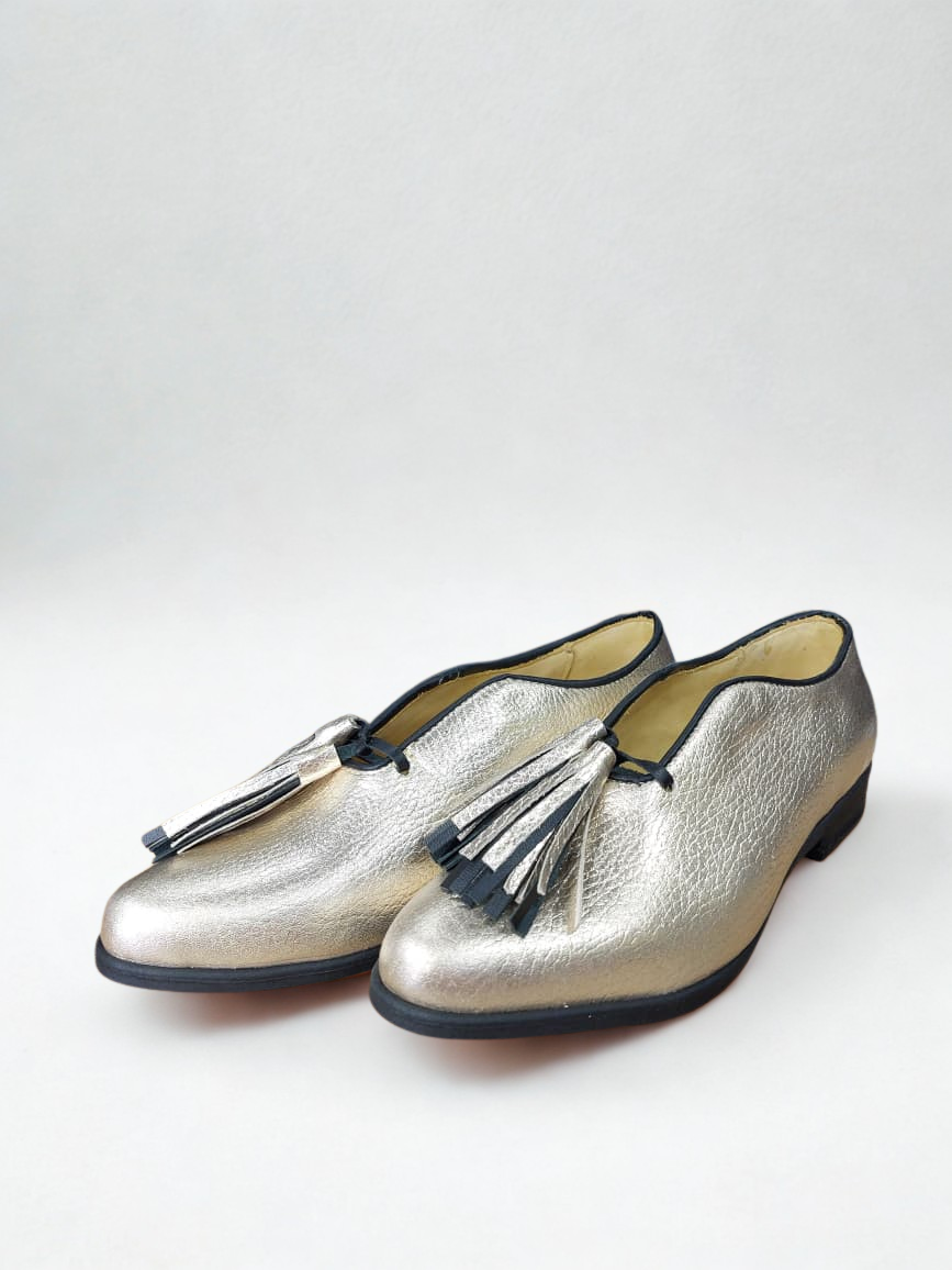 Babucha color dorado, con planta de goma flexible y cómoda. Su altura de 2,5 cm la hace perfecta para cualquier outfit.