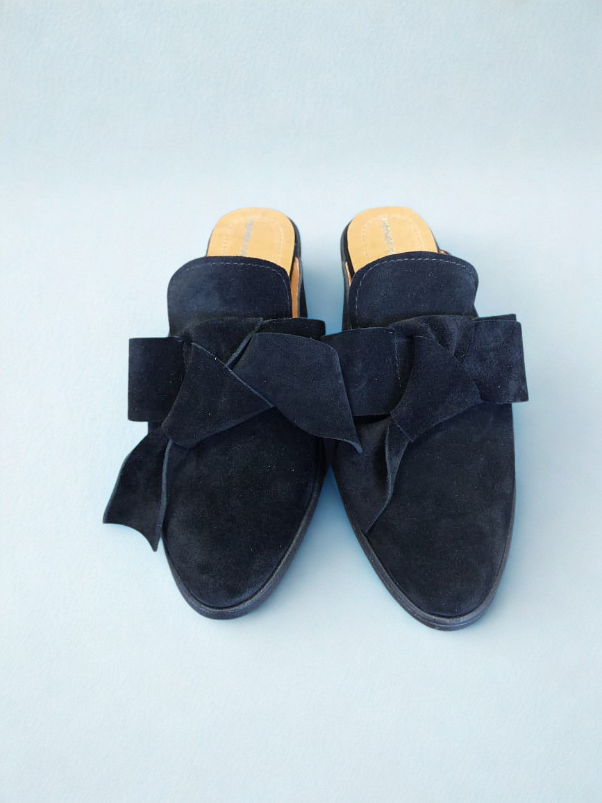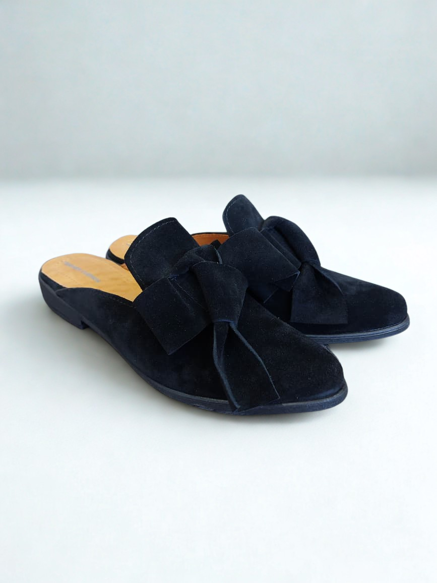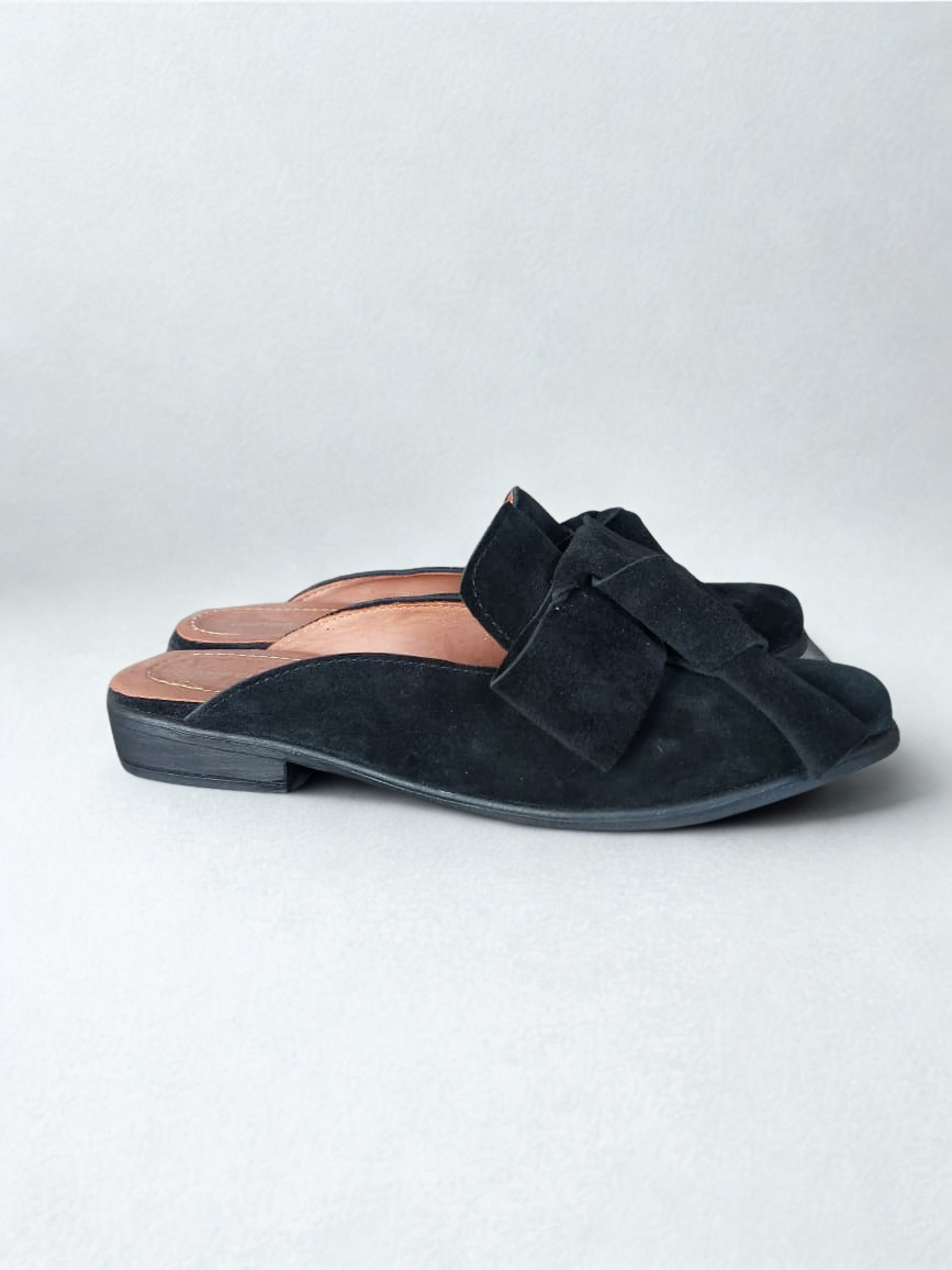 Babucha color negra en material tipo gamuza, con planta de goma flexible y cómoda. Su moño frontal aporta un toque delicado, y su altura de 2,5 cm la hace perfecta para el uso diario.