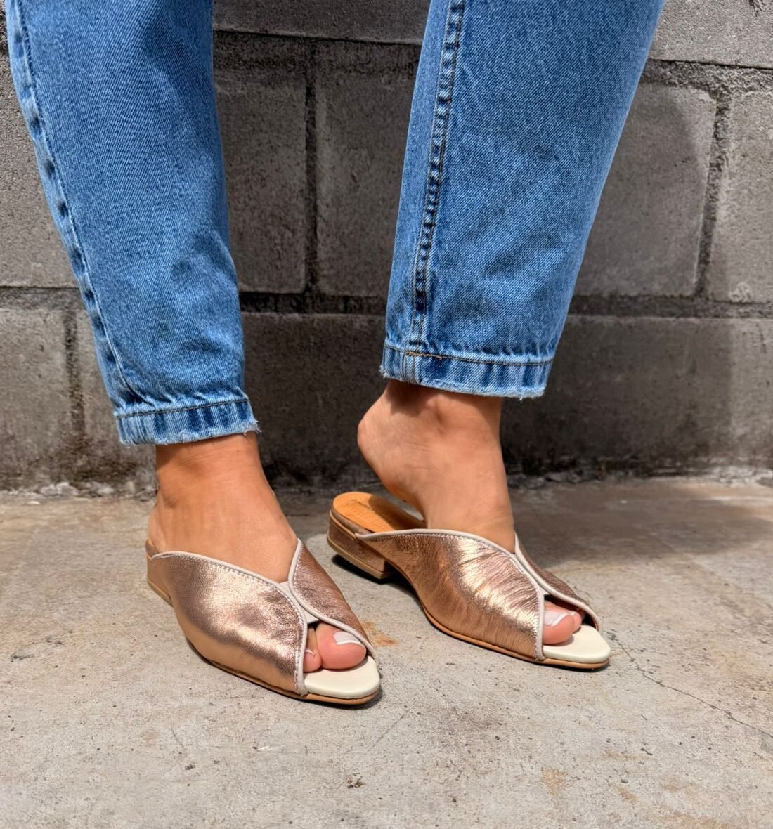 Babucha de cuero color cobre, con delicado detalle en beige y abertura frontal que aporta frescura y estilo. Confeccionada en cuero suave, cuenta con planta de suela y taco bajo de 2,5 cm, perfecta para un uso cómodo y sofisticado durante todo el día. Un diseño versátil que eleva cualquier look con un toque moderno y femenino.
