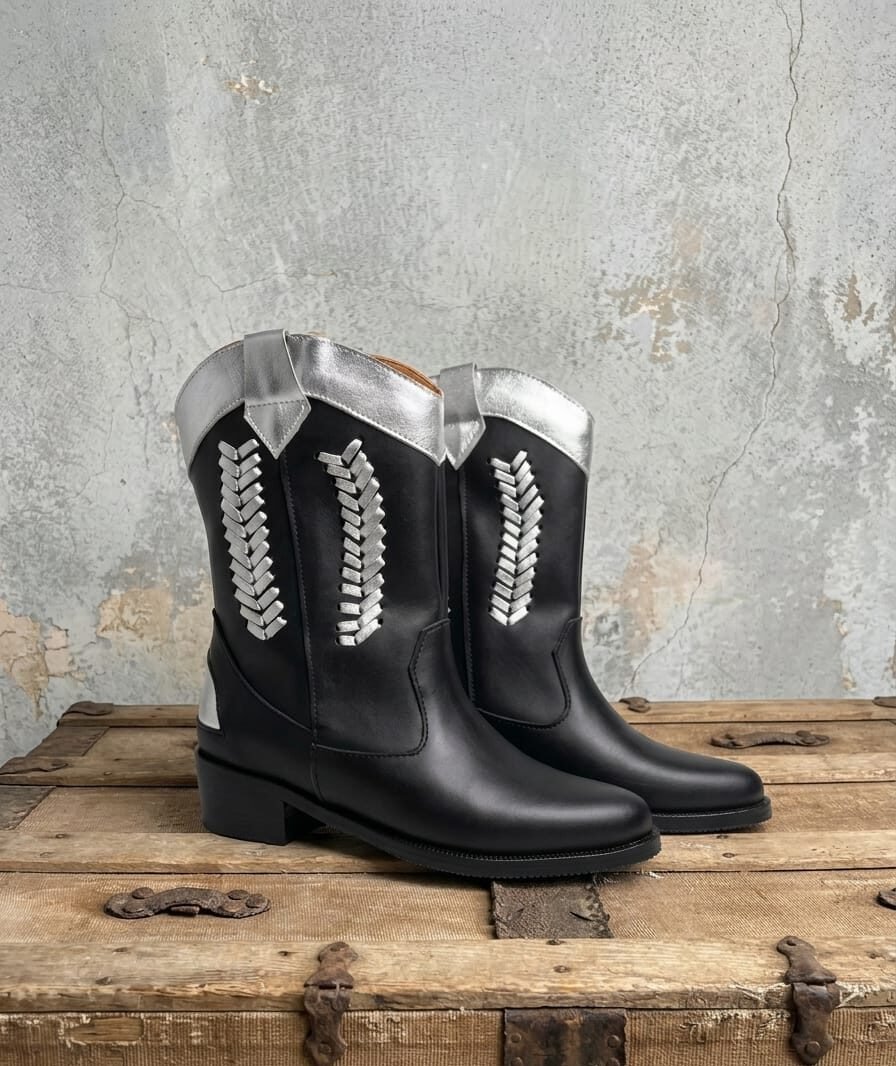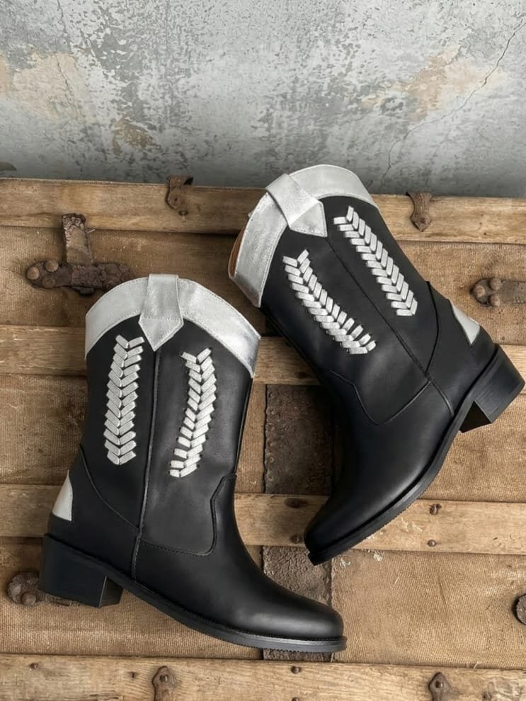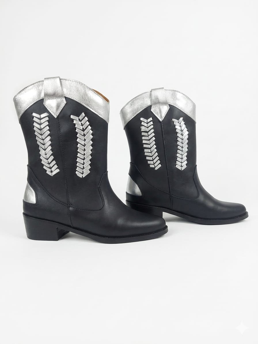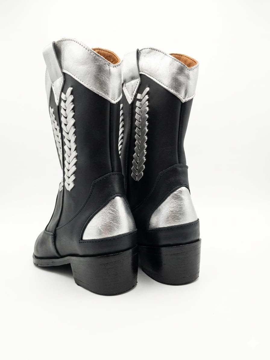 Bota 100% cuero con un estilo moderno y atrevido. Su diseño en negro con detalles plateados le da un toque cool y diferente que levanta cualquier outfit. Tiene un taco de 4 cm perfecto para andar cómoda todo el día sin perder estilo. Ideal para looks urbanos, con onda y mucha personalidad.