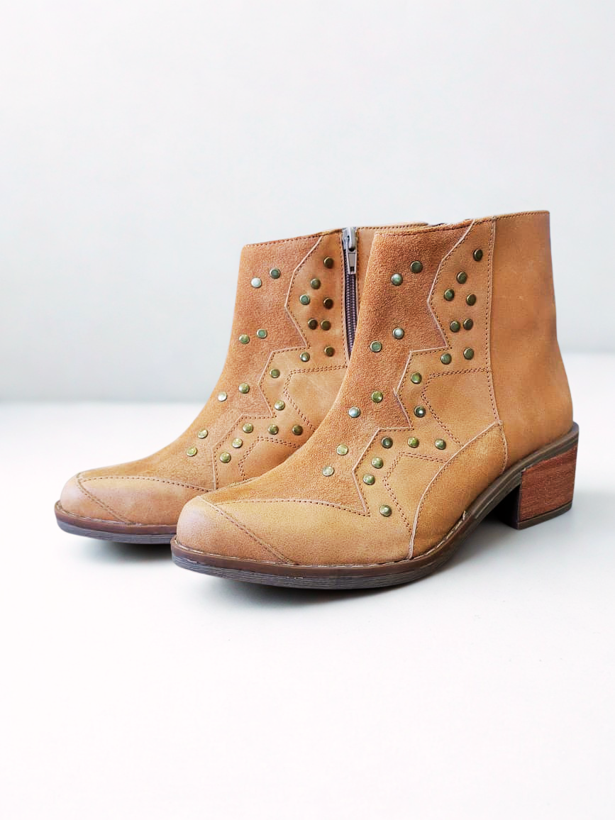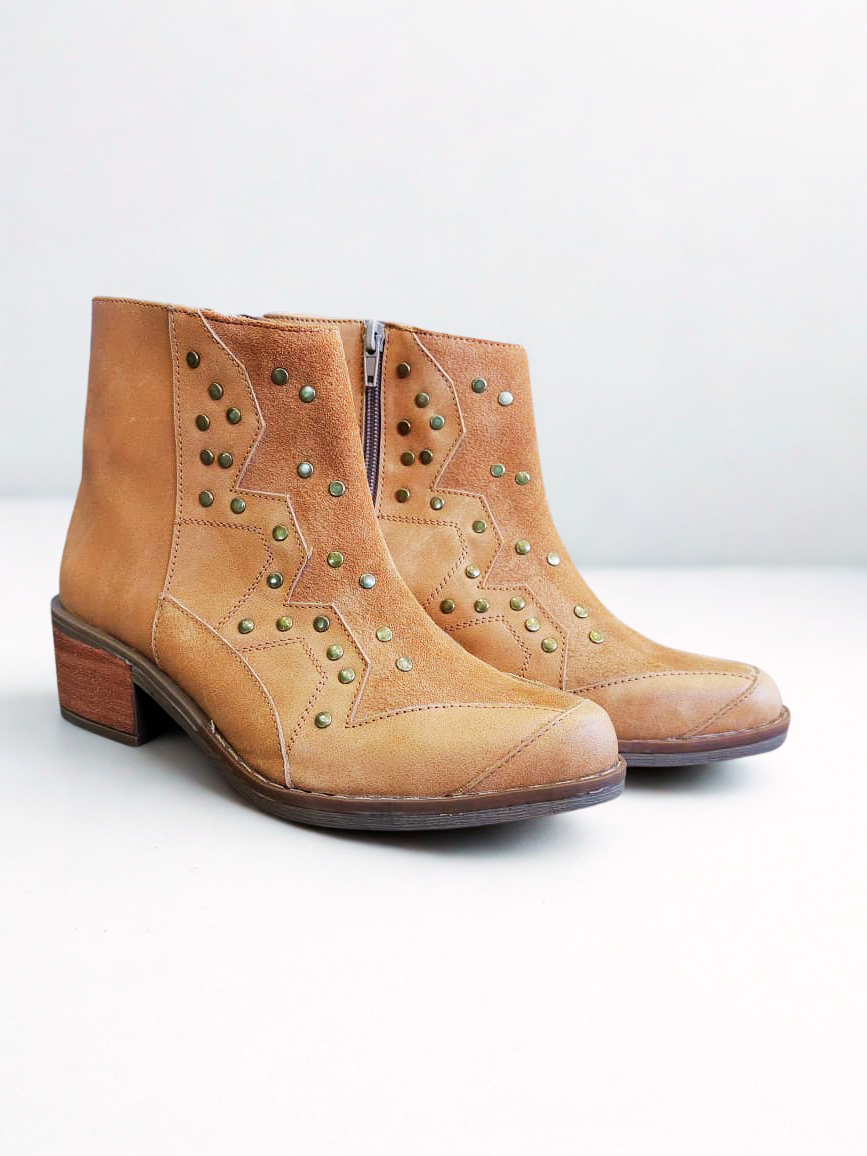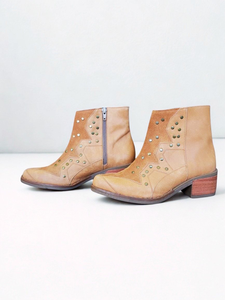 Botines 100% cuero en camel con diseño vaquero y tachas doradas. Elegantes, versátiles y perfectos para iluminar cualquier outfit. Su combinación de cuero y gamuza, junto al detalle de tachas, crea un estilo moderno ideal para usar en cualquier temporada.
