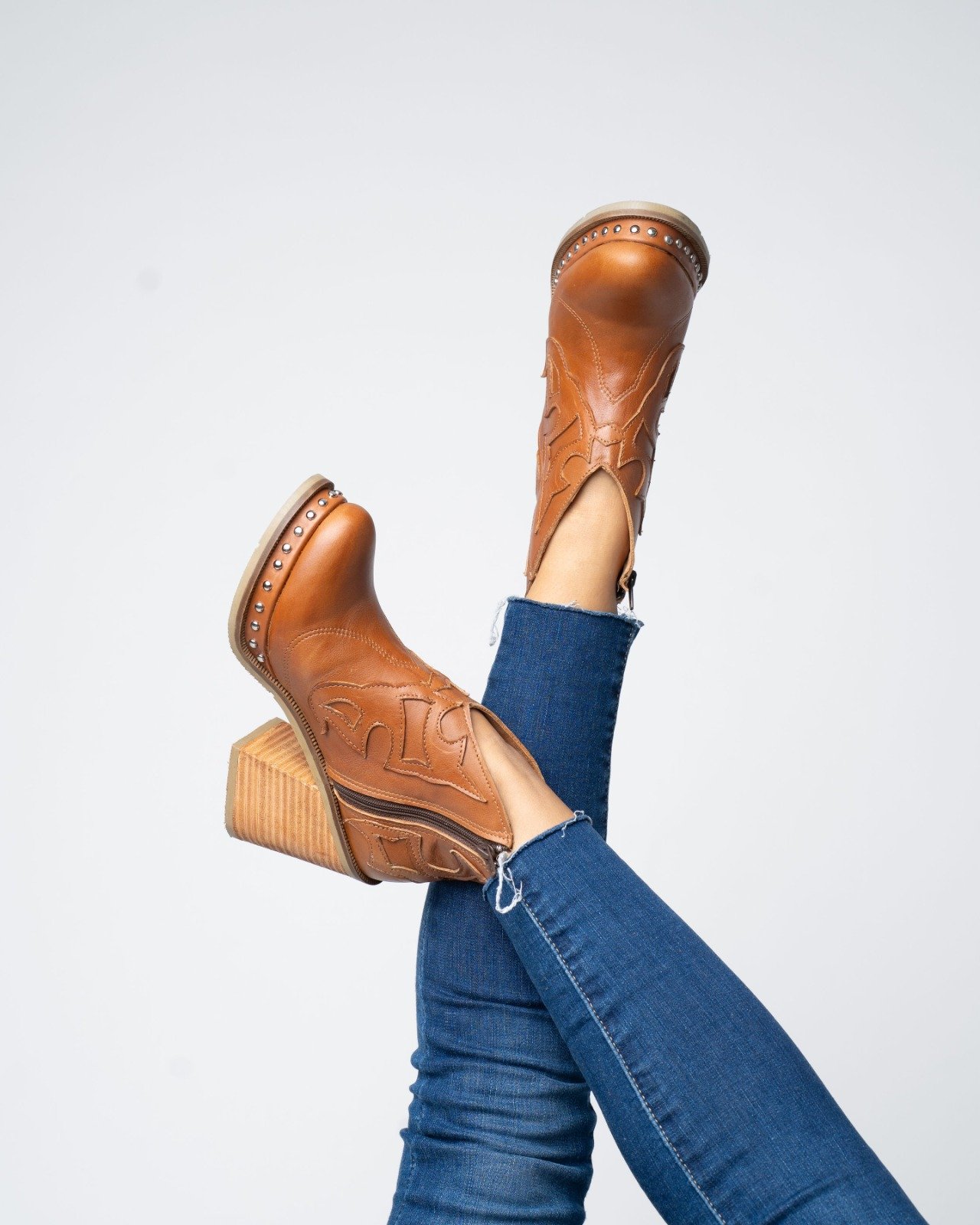 Botín estilo western en color camel, elaborado en 100% cuero. Cuenta con tacón ancho de 10 cm, detalles bordados y tachas plateadas alrededor de la suela. Un diseño moderno, resistente y perfecto para complementar cualquier outfit.