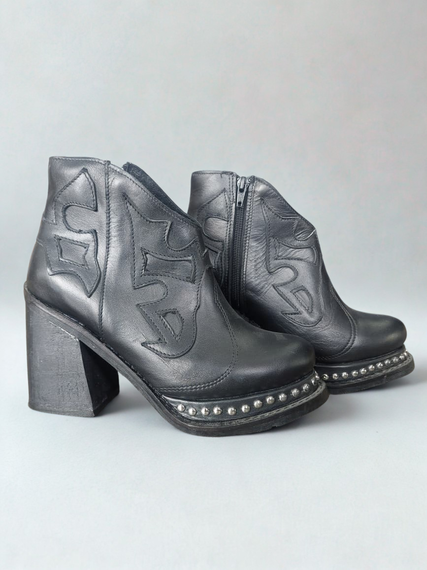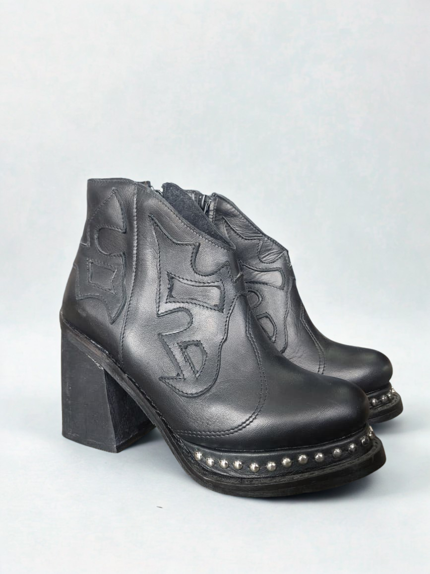 Botín estilo western en color negro, fabricado en cuero 100%. Incluye tacón ancho de 10 cm, detalles bordados y tachas color plateadas alrededor de la suela. Ideal para un look moderno y versátil.