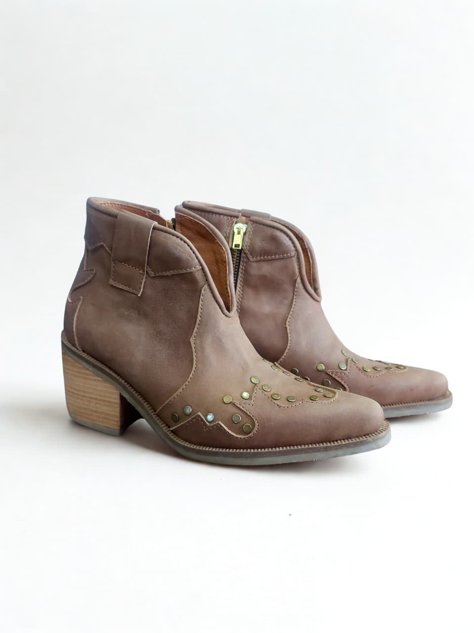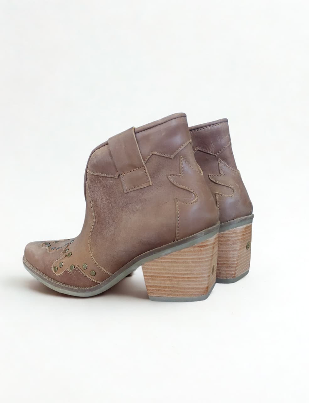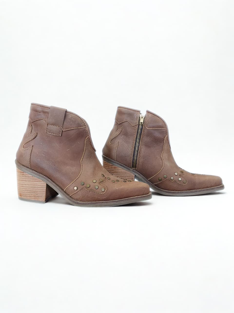 Botín en cuero color café achocolatado, con diseño western y aplicaciones de tachas metálicas que realzan su personalidad. Taco estilo madera de 7 cm, cómodo y firme, más cierre lateral para un calce práctico. Perfectos para darle un toque vaquero y sofisticado a tus looks.