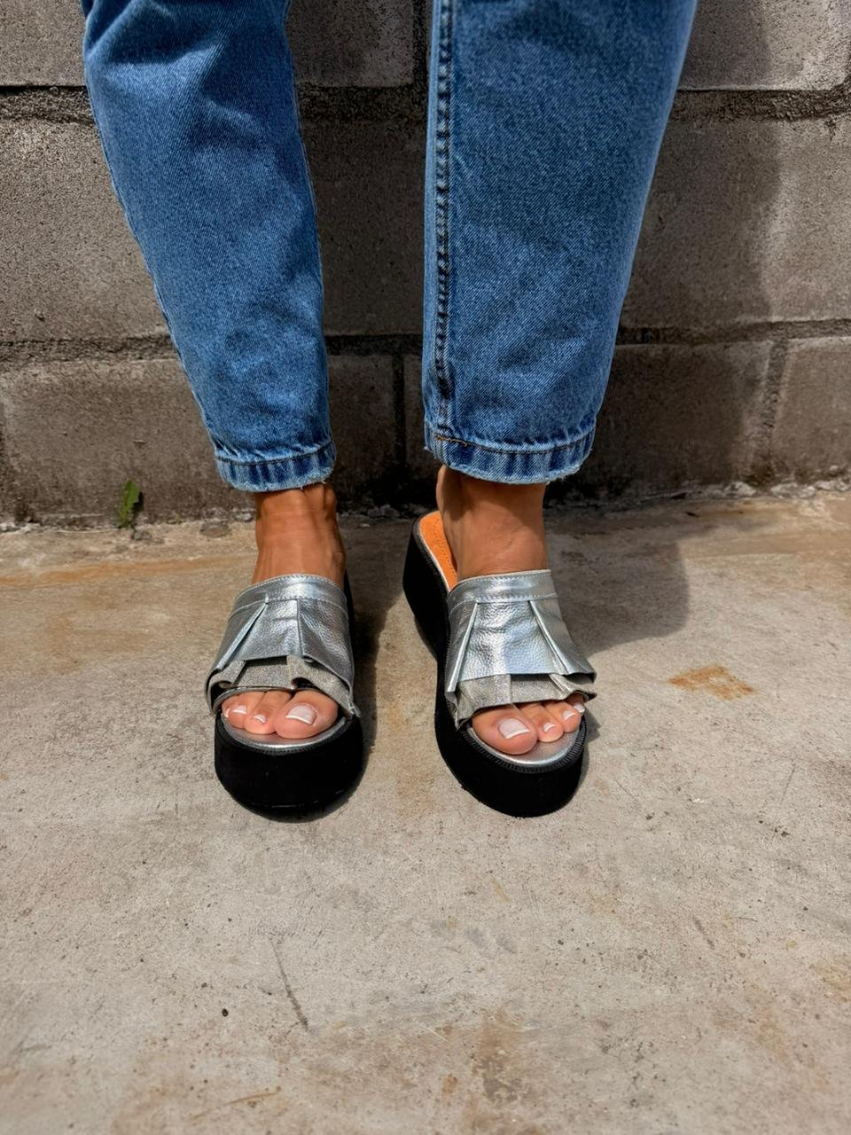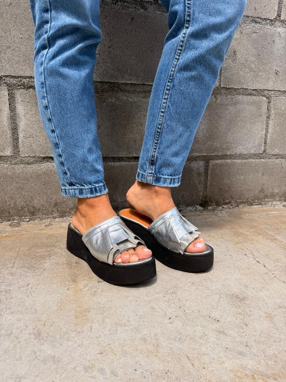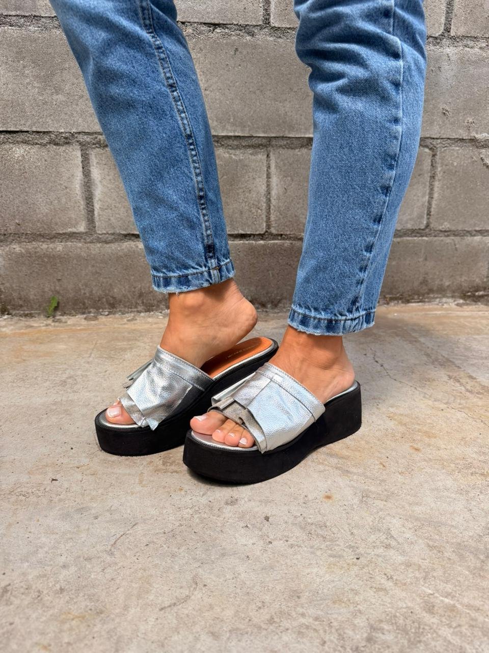 Sandalia plateada con brillos, 100% cuero, simple y elegante. Tiene una plataforma de goma de 5 cm, que aporta comodidad y un elevara tus outfits de verano