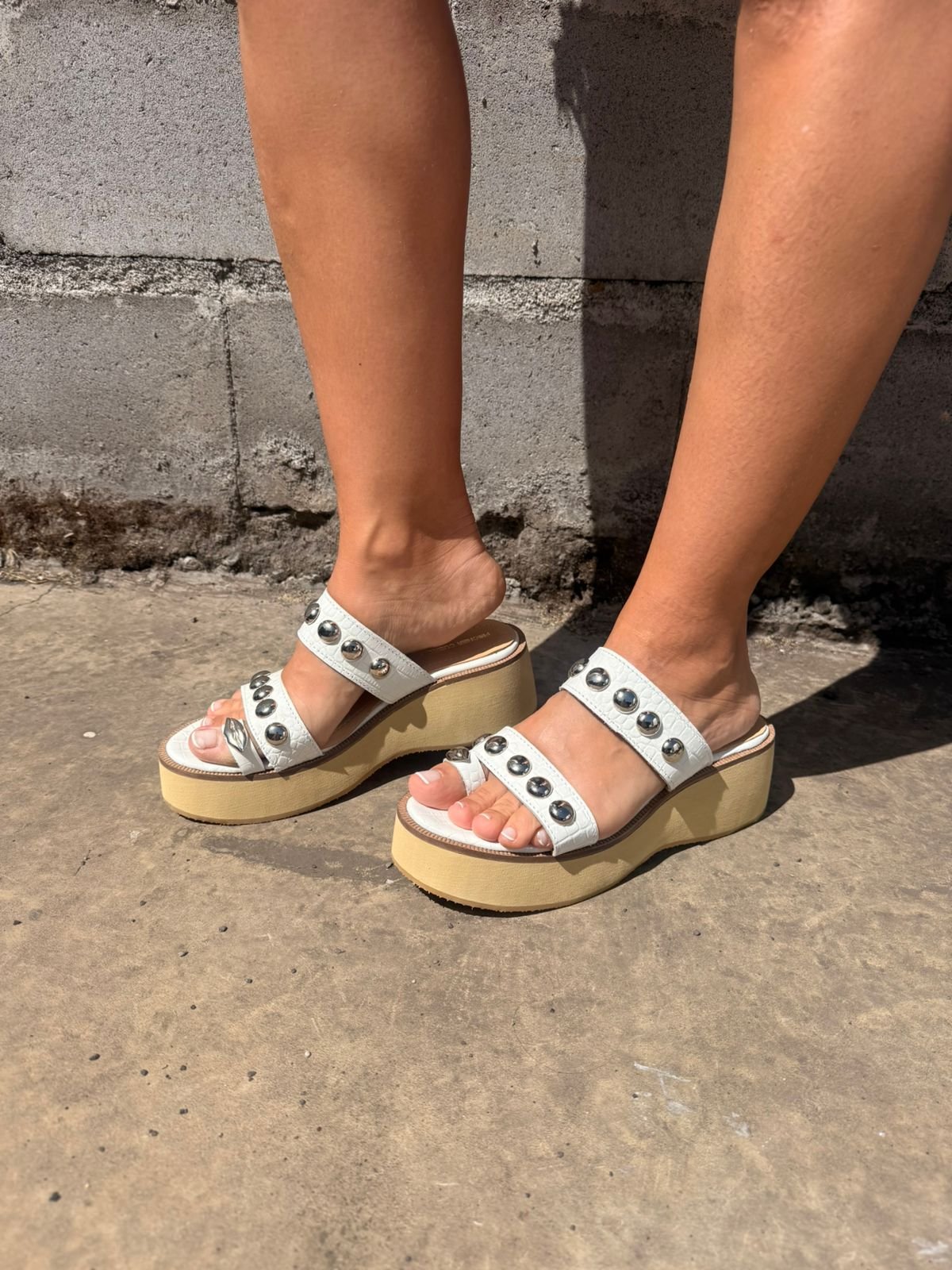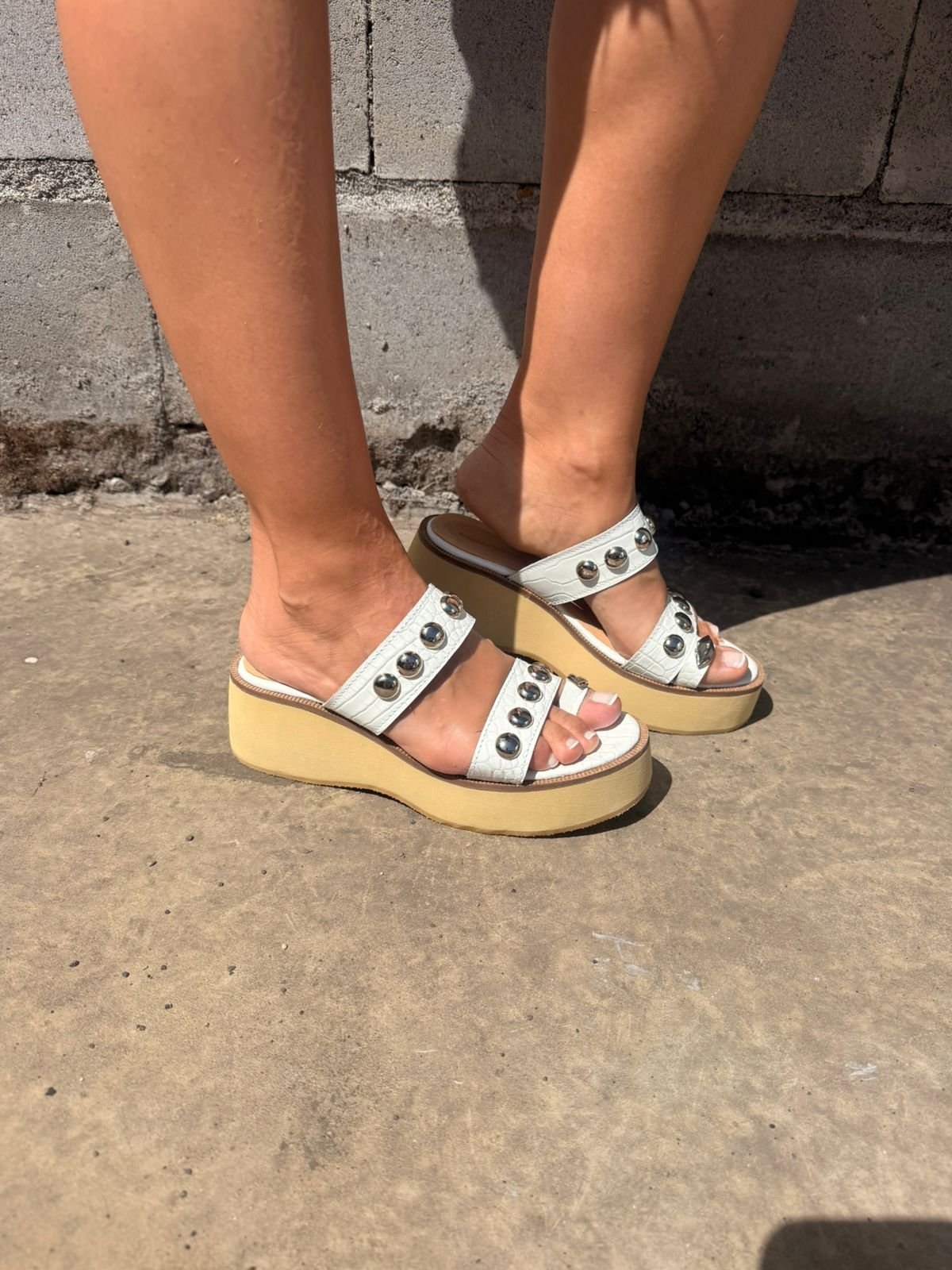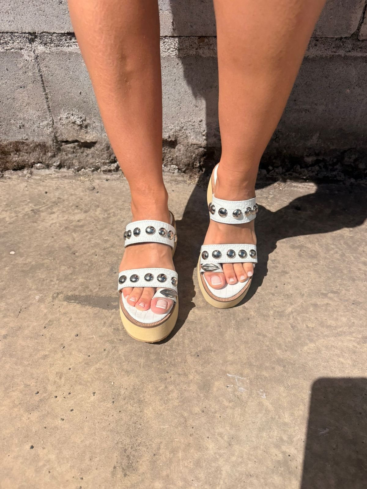 Sandalia 100% cuero en color blanco, con tachas metálicas y delicado detalle de beso. Plataforma de 6 cm que aporta altura, comodidad y un toque distintivo.