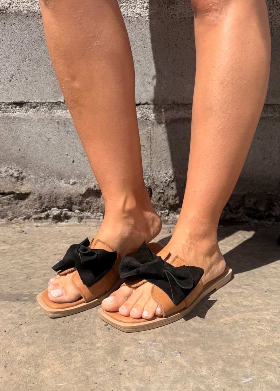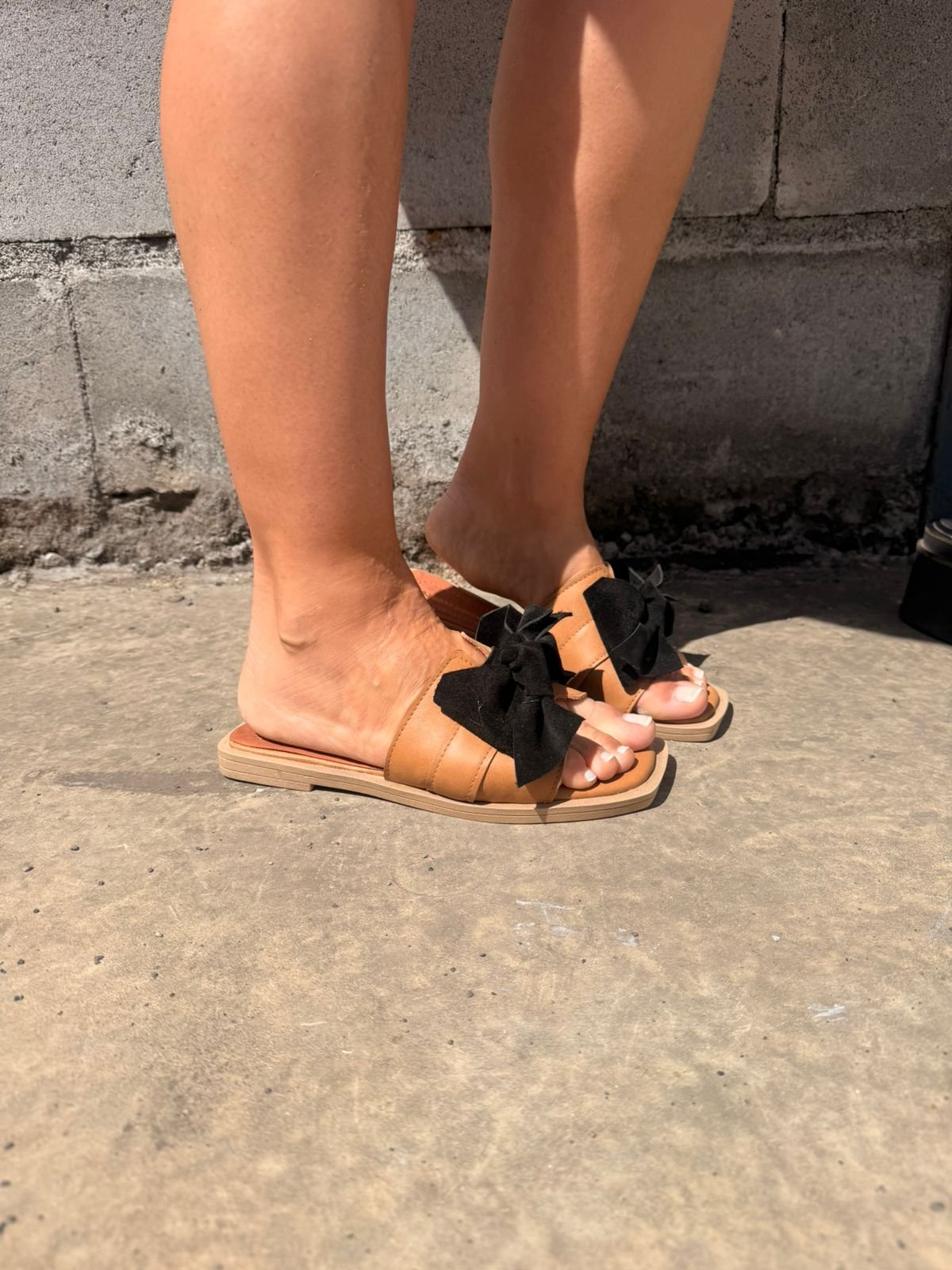 Sandalia 100% cuero camel, con lazo de gamuza negro y planta de goma 2,5 cm. Un básico chic para el día a día.