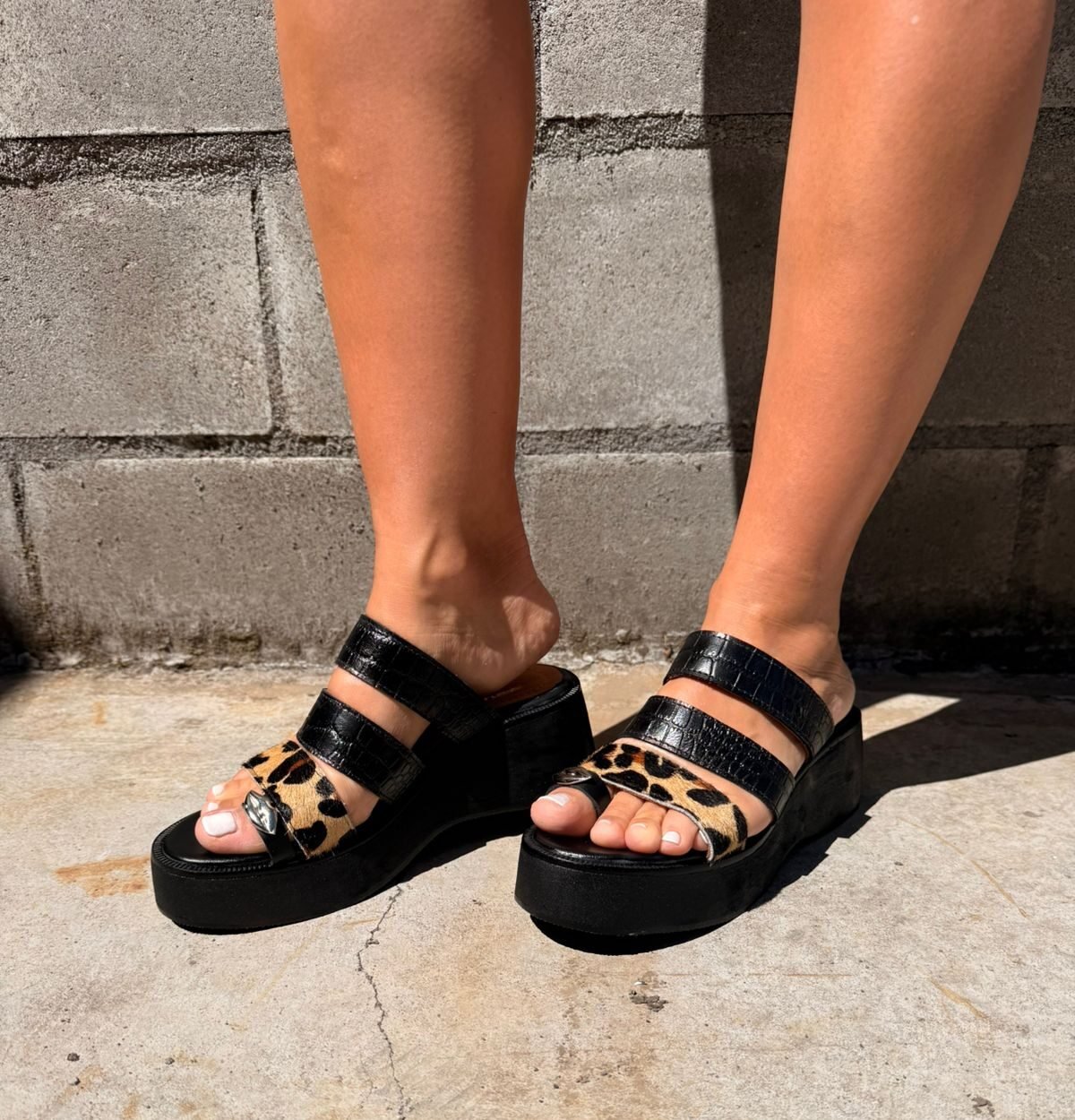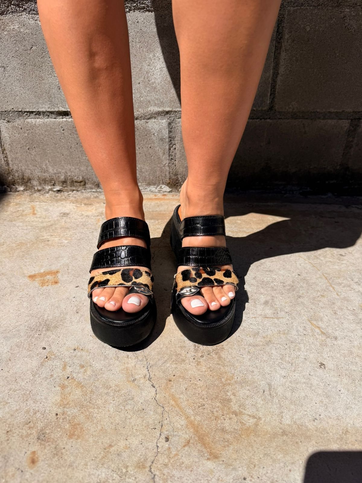 Sandalia 100% cuero en color negro, con plataforma de 5 cm de altura que aporta comodidad y estilo. Presenta un elegante print animal en la banda frontal, acompañado de un delicado detalle de tacha en forma de beso, que suma un toque distintivo y femenino. Las tiras negras de acabado sofisticado completan un diseño moderno y versátil, ideal para elevar cualquier look diario con personalidad