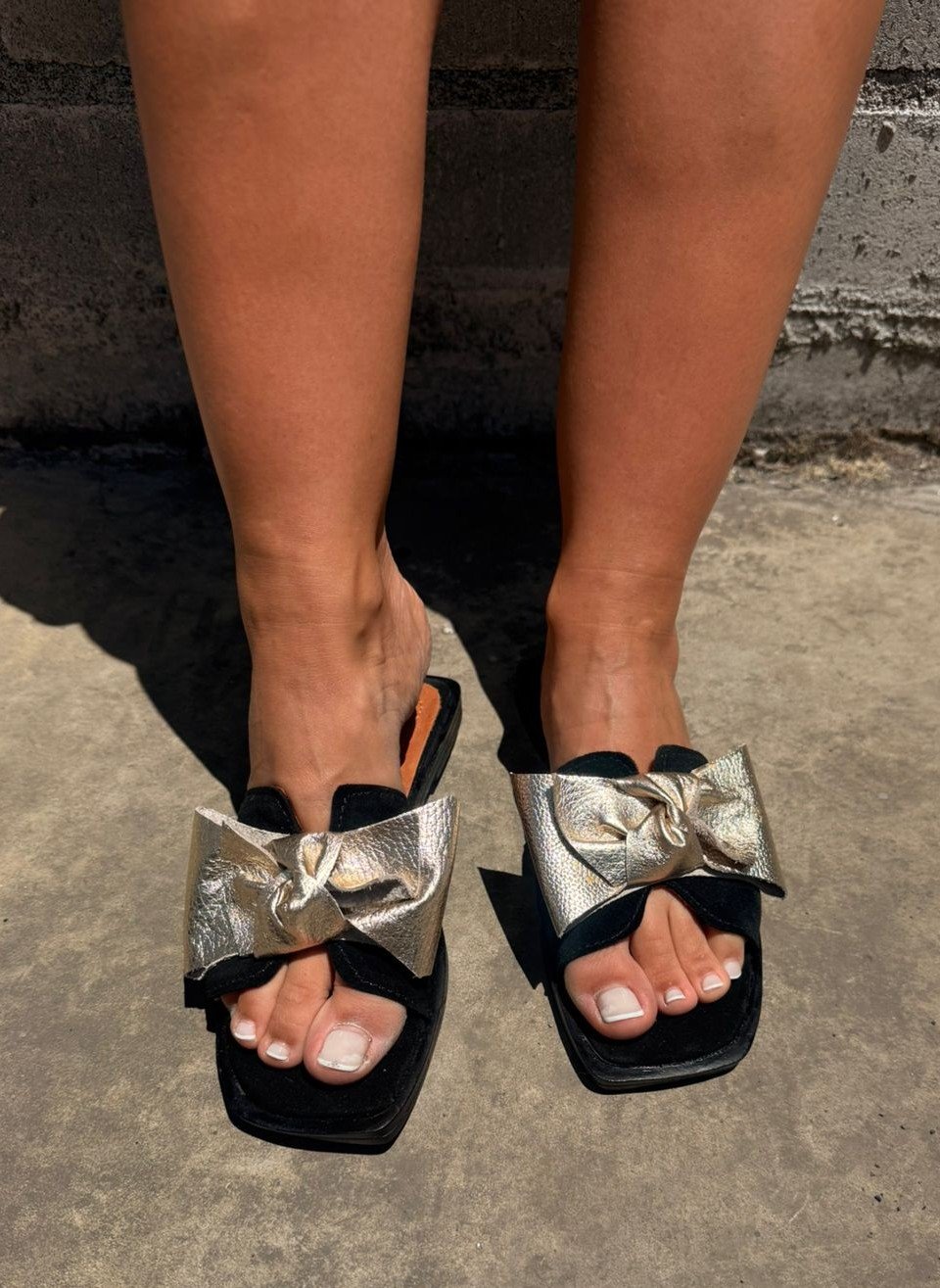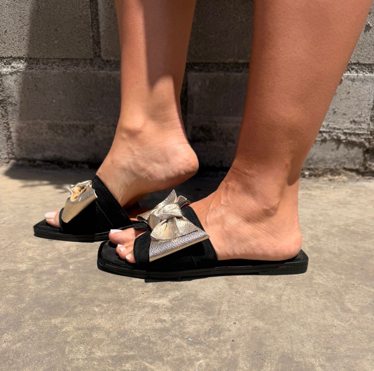 Sandalia 100% cuero en reno negro, con lazo de cuero liso en dorado y planta de goma 2,5 cm. Un básico chic para el día a día.