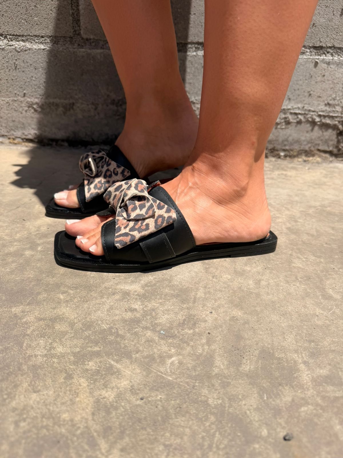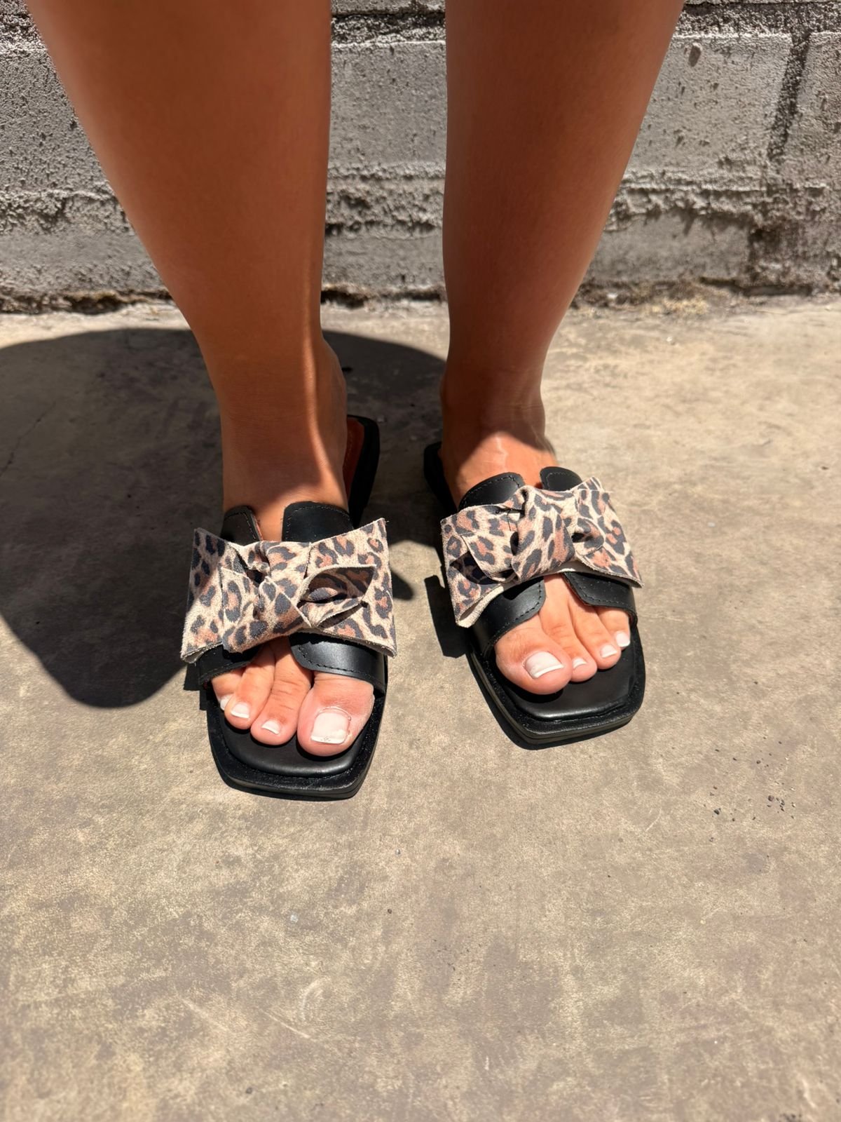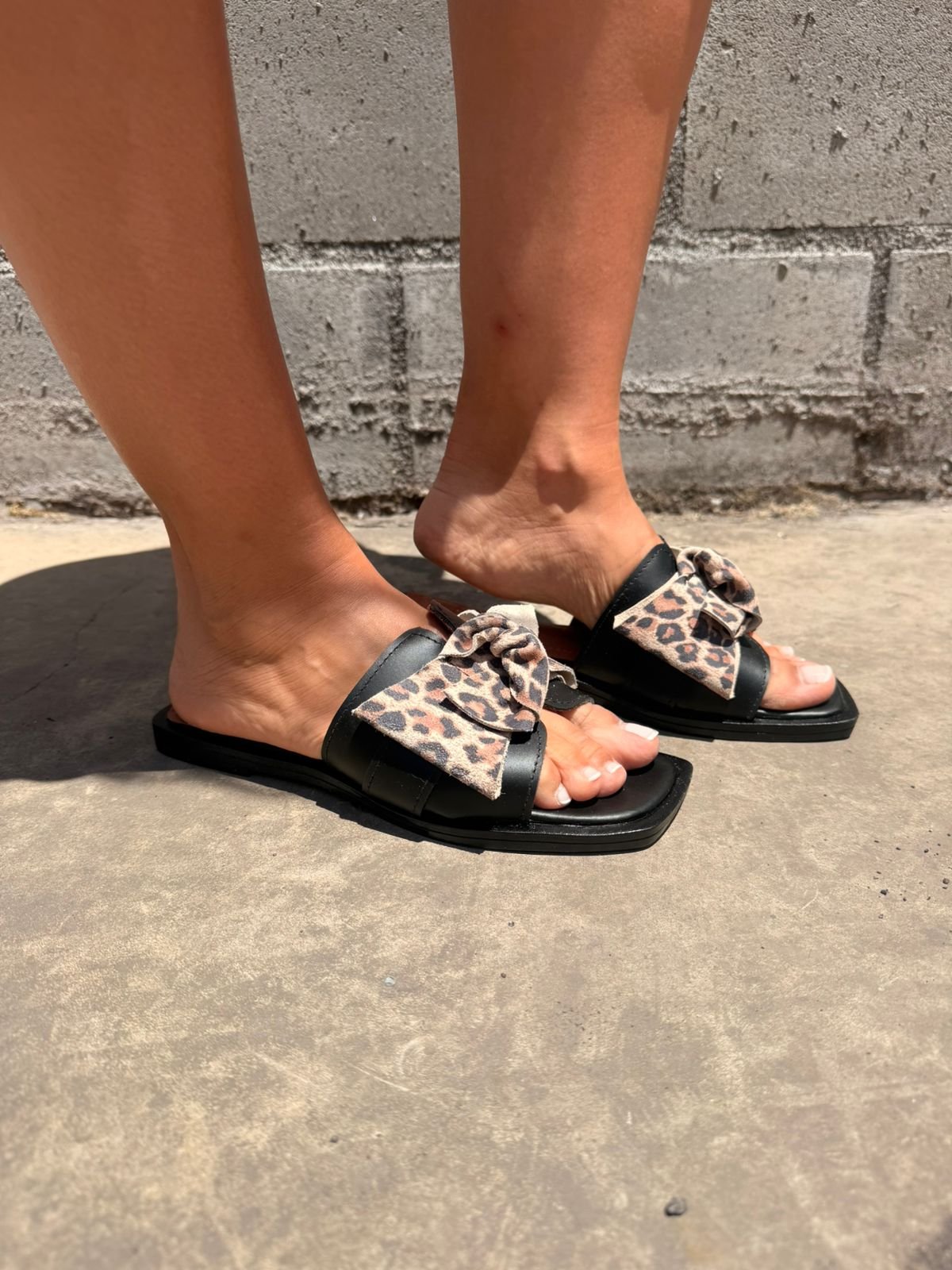 Sandalia 100% cuero liso en negro, con lazo con detalle print y planta de goma 2,5 cm. Elegante y cómoda para el día a día.