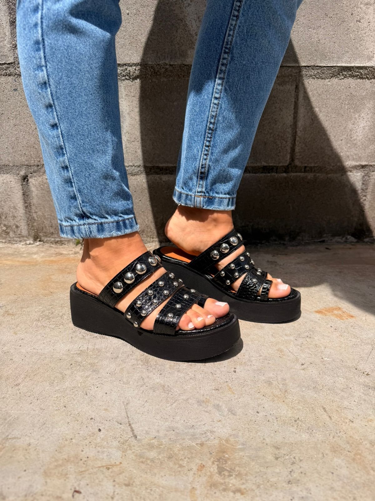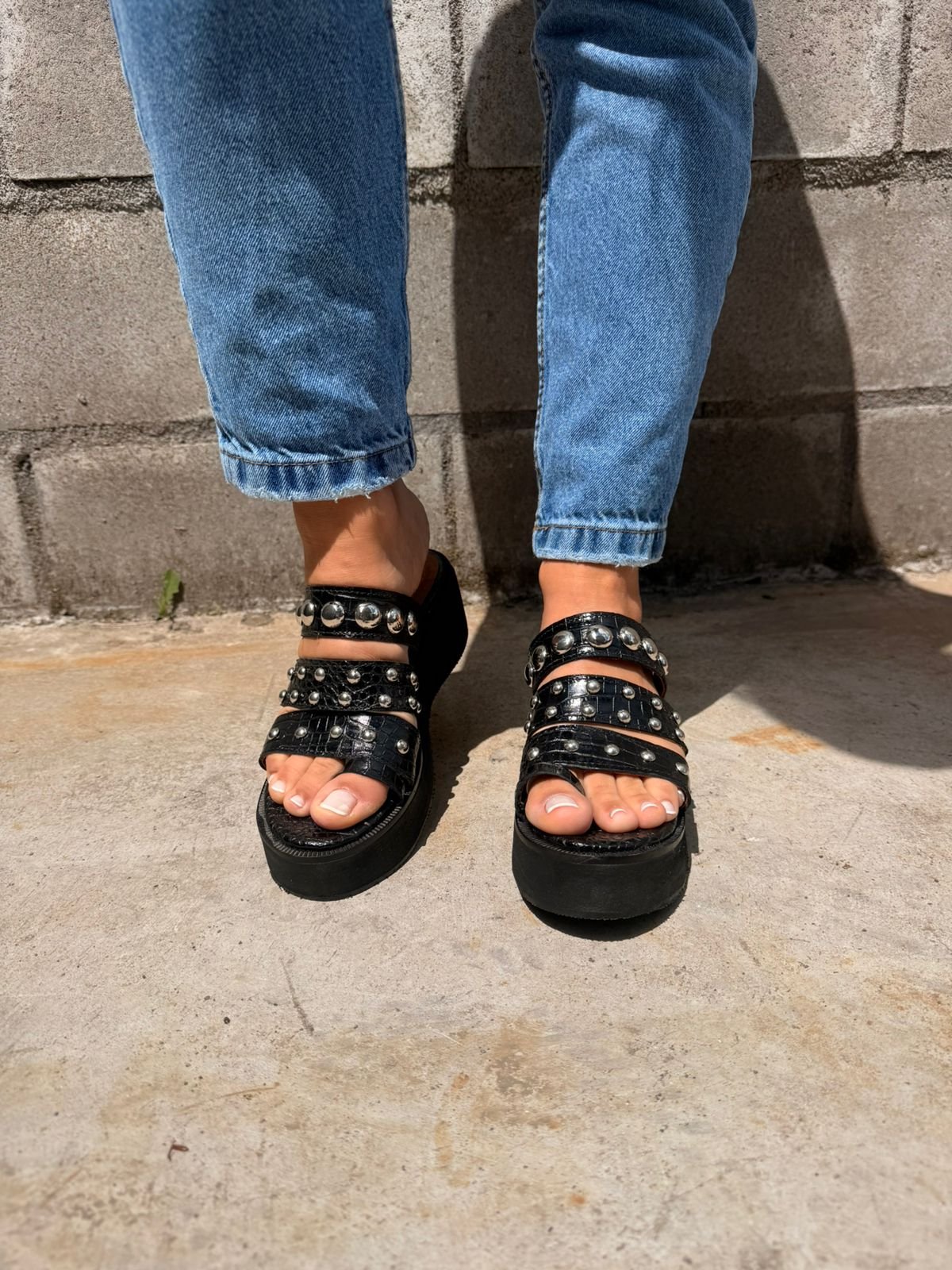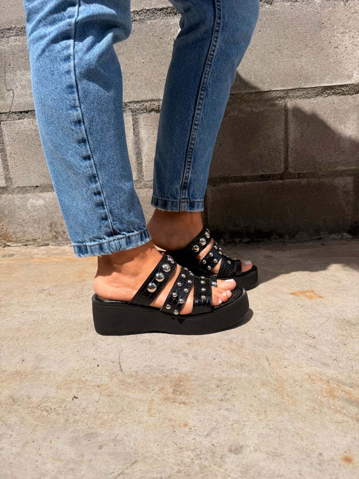 Sandalia 100% cuero en color negro con tachas metálicas, plataforma de 6 cm que aporta altura y comodidad. Un diseño moderno y elegante para todos los días.