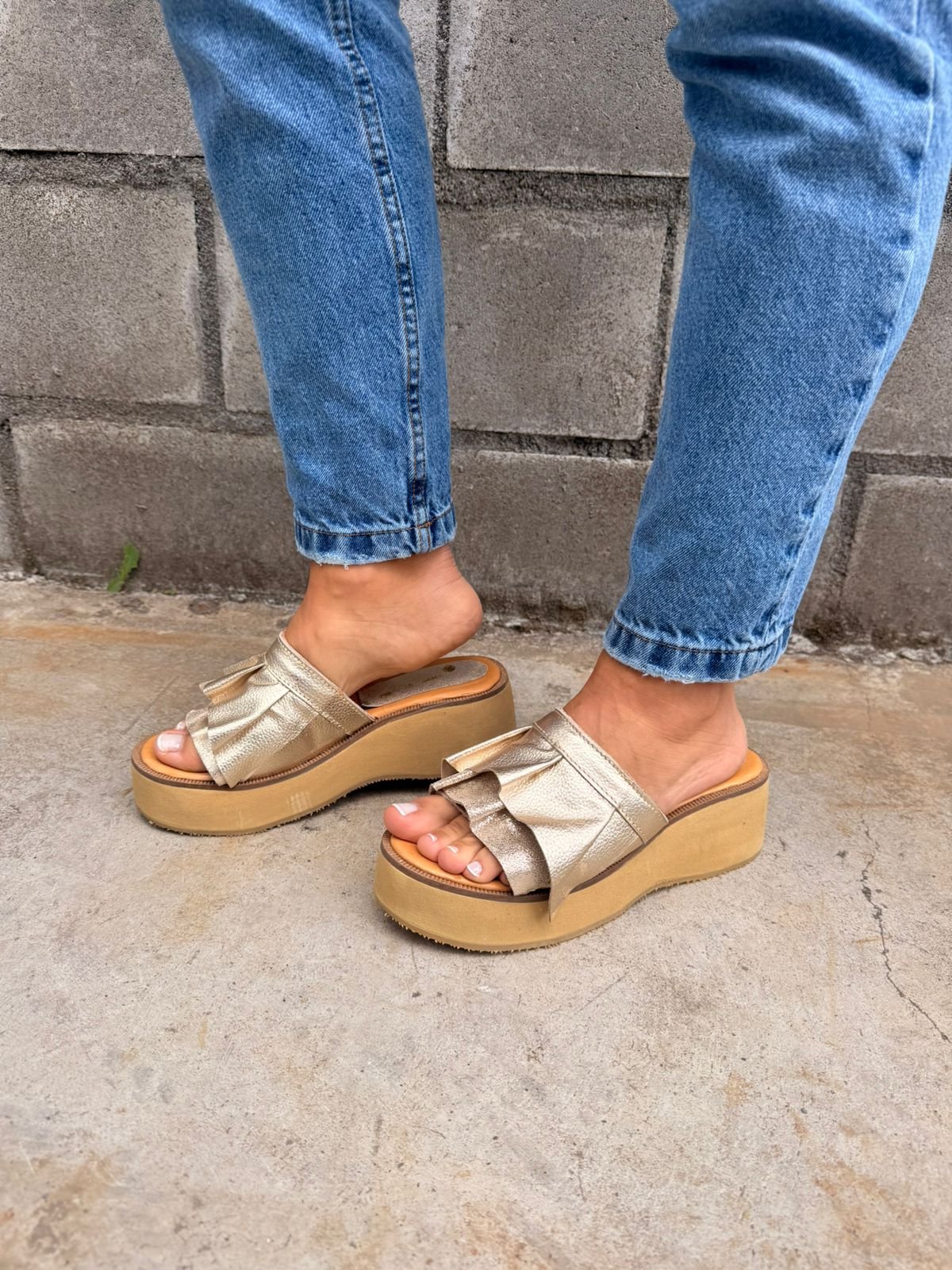 Sandalia de cuero dorado con vuelos, para darle un toque de originalidad, perfecto para cualquier outfit.
