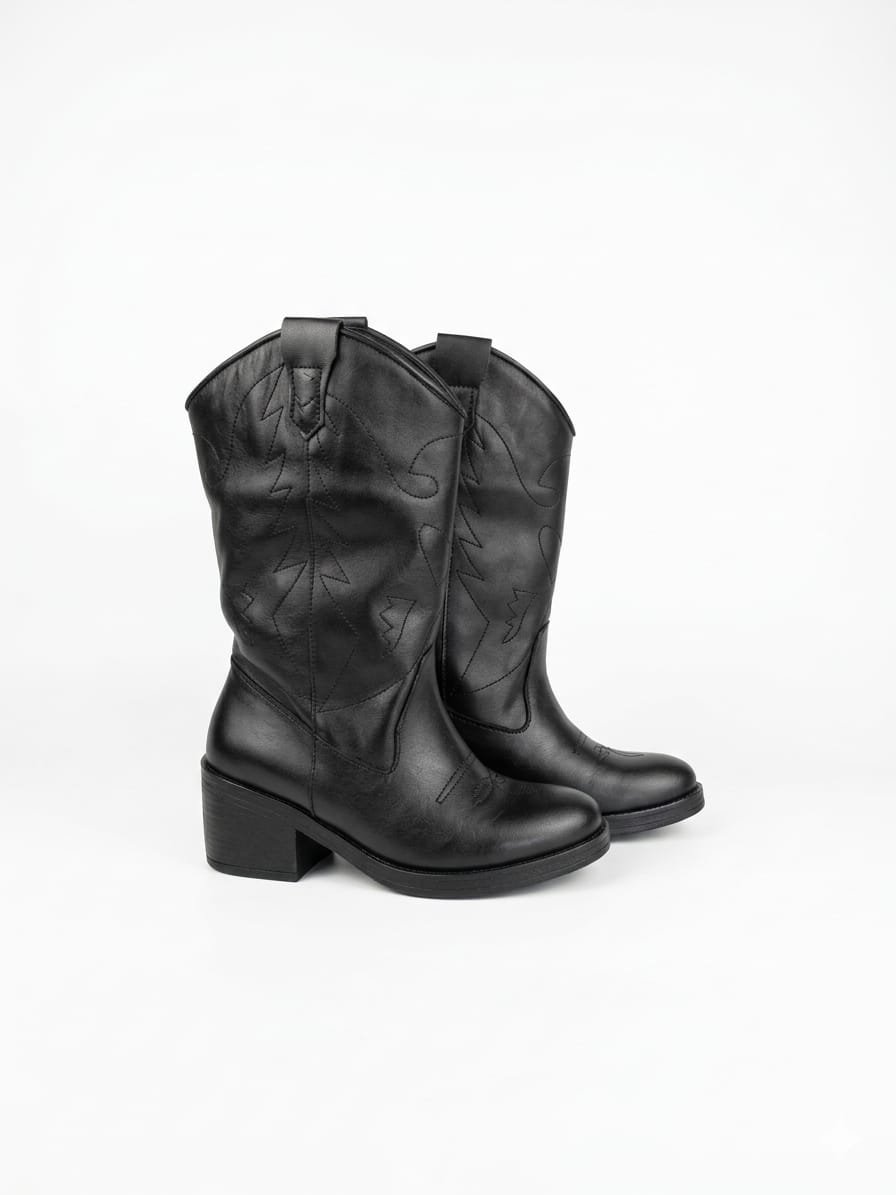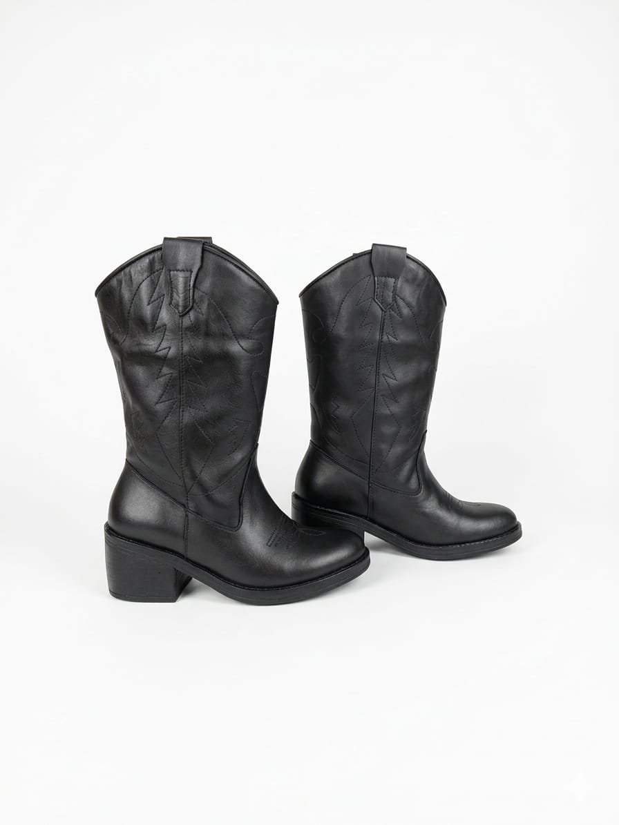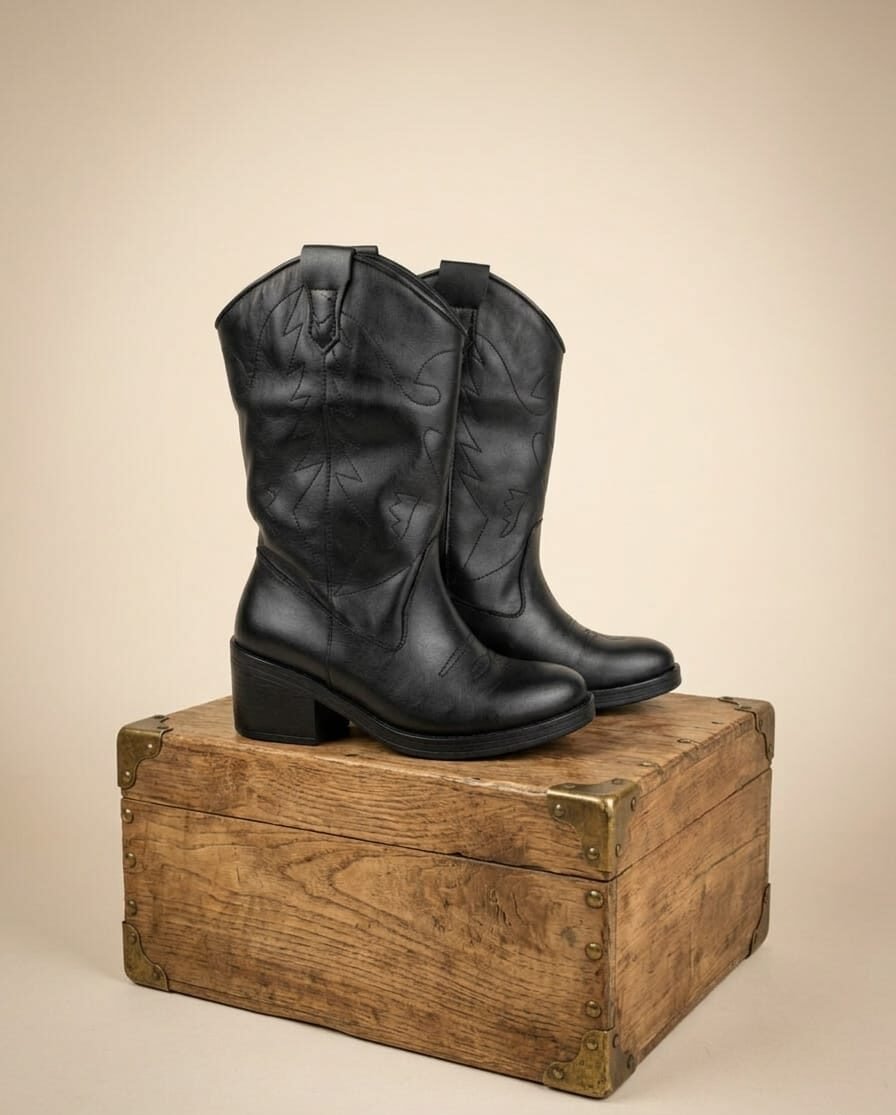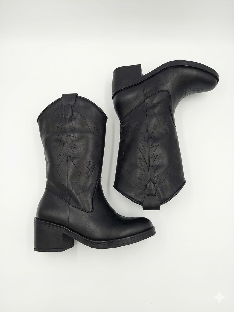 Bota vaquera 100% cuero en color negro con taco de 6 cm, diseñada para combinar estilo y carácter. Su diseño presenta costuras decorativas de inspiración western que aportan un acabado clásico y atemporal. Cómoda y versátil, es una opción ideal para complementar distintos looks, desde outfits casuales hasta estilos más definidos con personalidad.