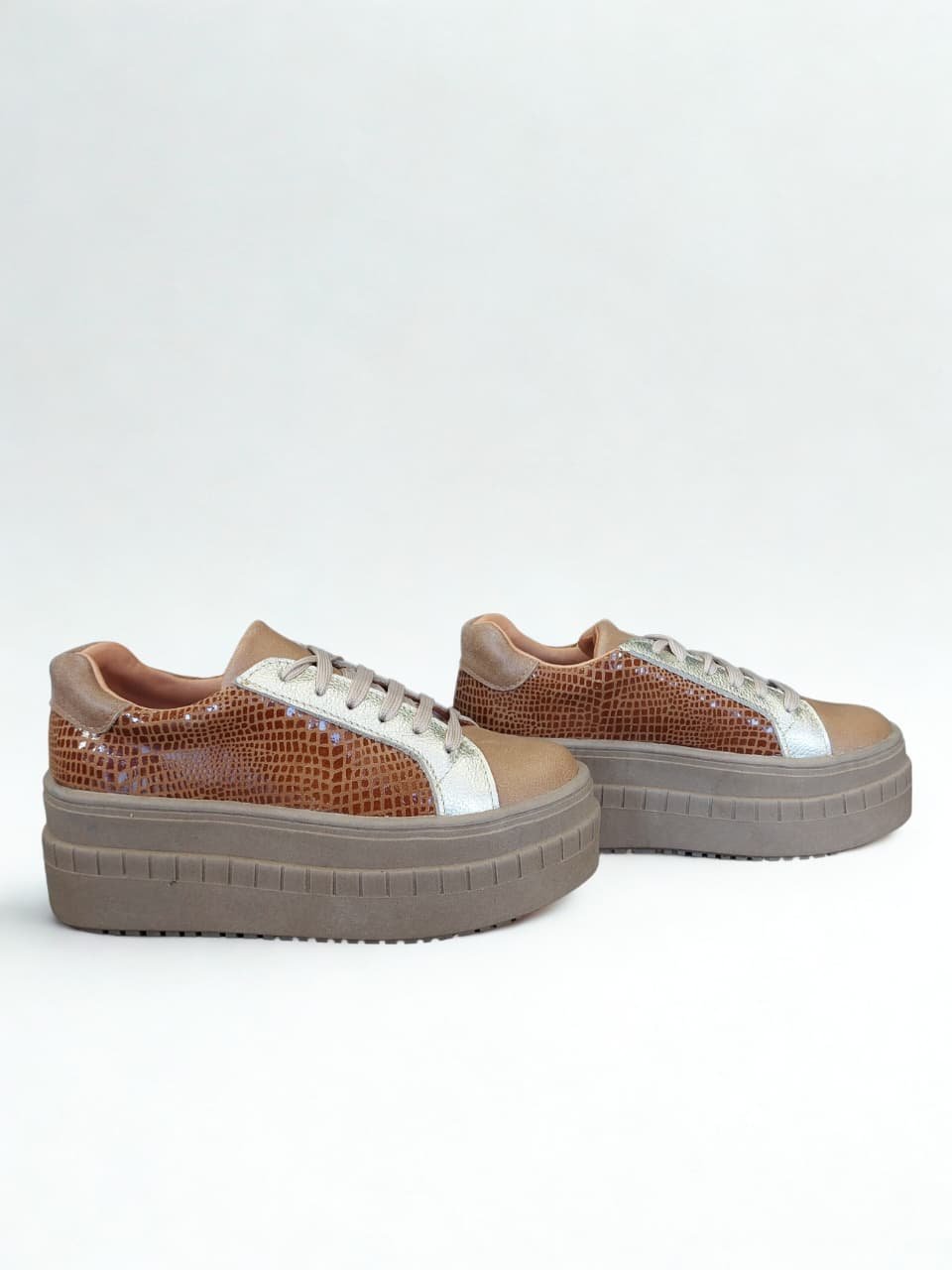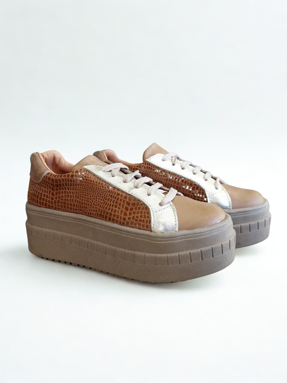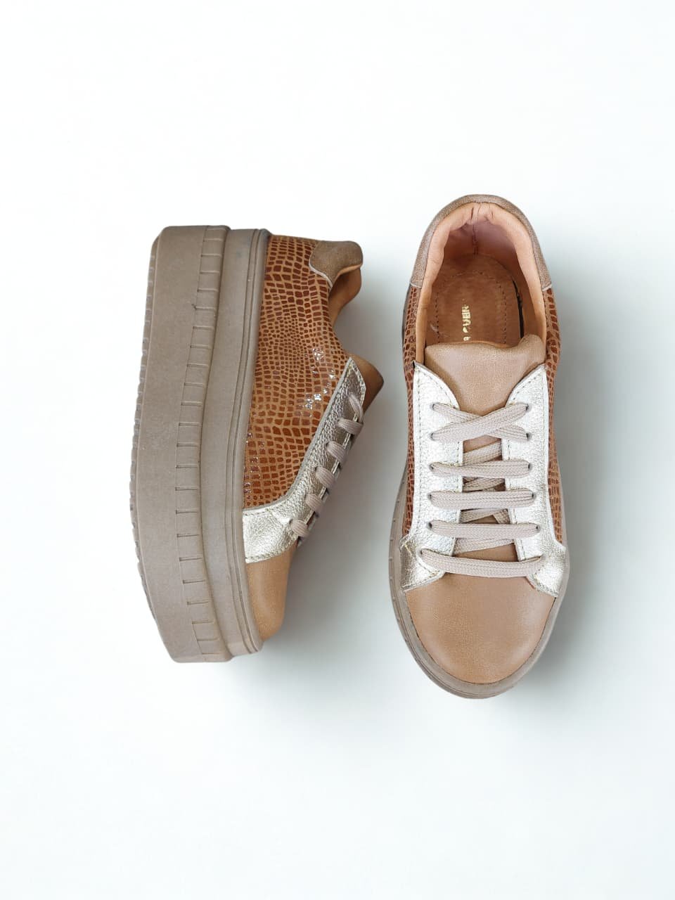 Zapatilla 100% cuero con plataforma de 6 cm, diseñada para quienes buscan estilo y altura sin perder comodidad. Su diseño combina un tono camel con textura café de leve brillosidad, creando un acabado sofisticado y moderno. Los detalles dorados aportan un toque de luz y elegancia, convirtiéndola en una pieza versátil que eleva cualquier look, desde los más casuales hasta outfits más cuidados.