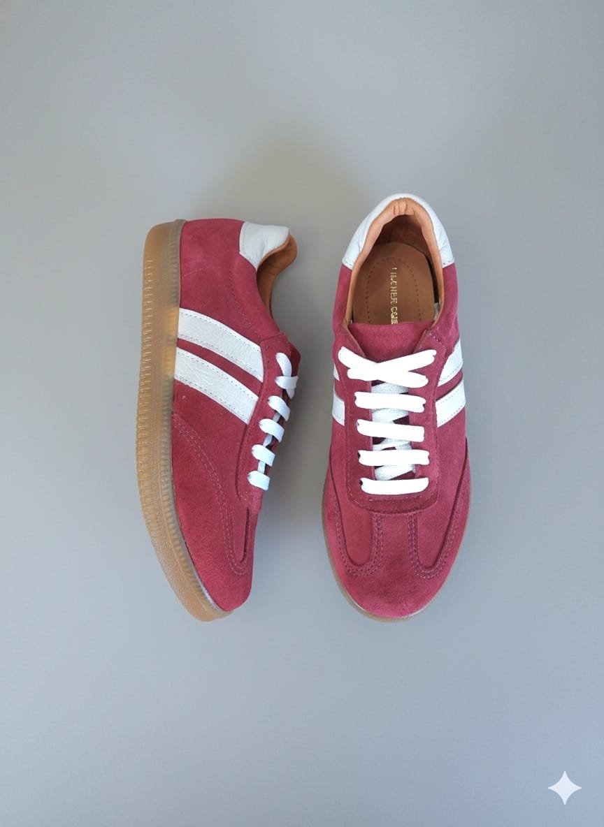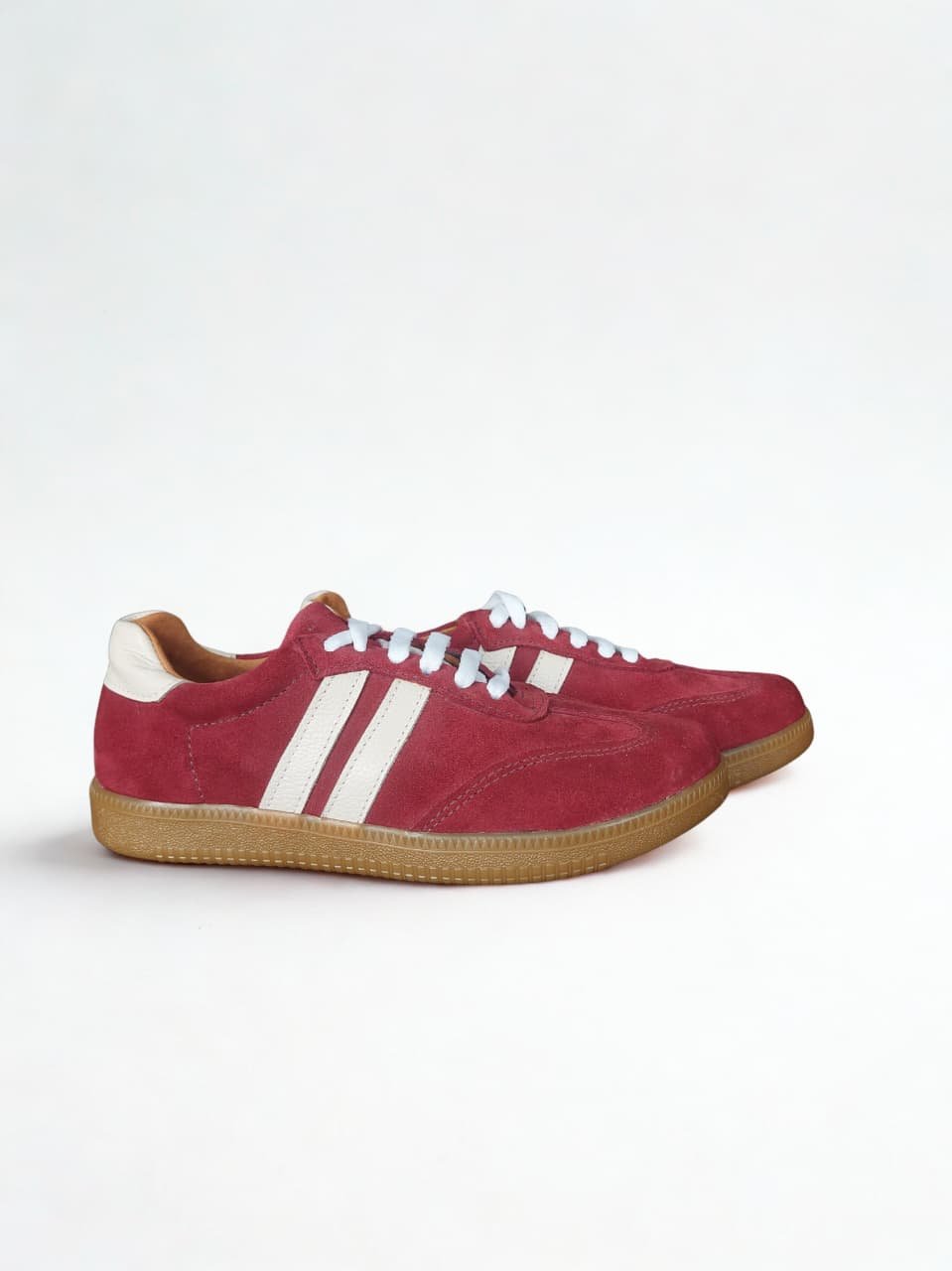 Zapatilla en tono burdeo confeccionada en reno 100% cuero, con líneas en cuero liso beige y cordones blancos que realzan su diseño clásico. Suela de goma color caramelo para un estilo atemporal y elegante.